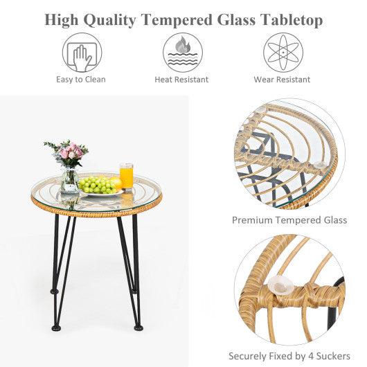 Supported by a sturdy steel frame with anti-slip foot pads this patio furniture set is super stable. And the weather-resistant rattan makes each piece of this bistro set durable enough to support a long service life. The strong tempered glass tabletop perfectly holds meals drinks and fashion magazines. In addition thick sponge padded seat cushions provide luxurious comfort for you and the cover of cushion can be removed with the smooth zipper for easy cleaning. Thanks to the modern and simple design this rattan furniture set can be placed anywhere you like.