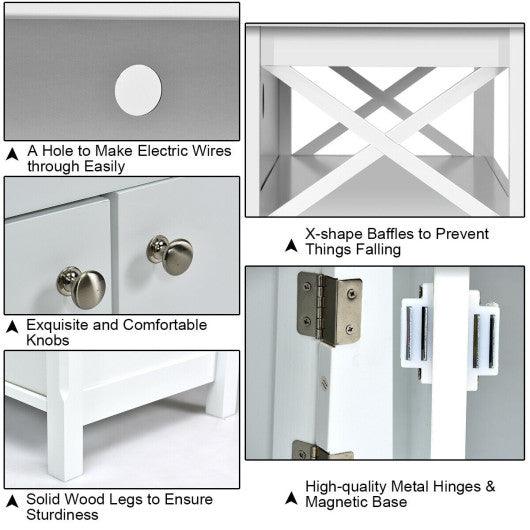 Made of finely select wood this TV stand with wire hole is sturdy and durable built for reliable lifelong use. The 2 cupboards and display shelves provide a large space for placing TV remotes books magazines photo albums or other items you need at hand or want as attractive decoration. As well there is a hidden hole in the back board so you can thread the wires of your many devices in an out of the way fashion that keeps your environment orderly and attractive. Featuring a bright white finish and X-shape wooden panels on both sides bring a modern style to your living room with this TV stand that blends with any home decor. This cabinet can be used in your living room bedroom kitchen or bathroom to help you to satisfy storage needs throughout your home. The unit is easy to quickly assemble.