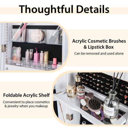 ● Large Storage Capacity and Bottom Shelf: Equipped with 108 earring slots 24 necklace hooks 65 ring slots 3 bracelet rods 2 storage bags 2 storage shelves 2 drawers 3 removable acrylic storage boxes and 1 lipstick tray this standing jewelry armoire can keep all your beauty items well organized. Besides the bottom shelf provides additional storage space for your bags high heels books and other items.