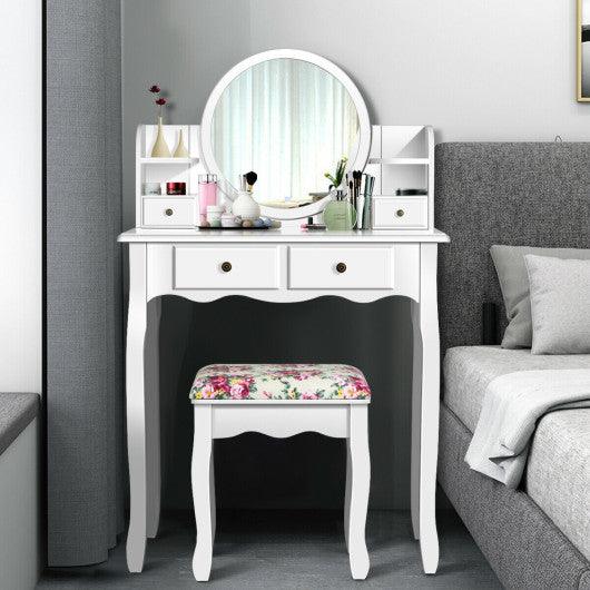 - 4 Storage Shelves & 4 Functional Drawers: Equipped with ample tabletop 4 drawers and 4 shelves this vanity table provides enough space to place your cosmetics lotions perfumes brushes and other beauty essentials. At the same time the high baffles can prevent things from falling down.