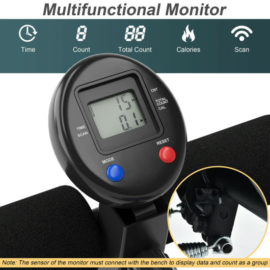 ● Multifunctional Monitor: Different from another traditional weight bench this sit-up bench is equipped with a clear monitor that feeds back the data you need in real-time such as time count total count and calories. In addition the multifunctional monitor is easy to operate.